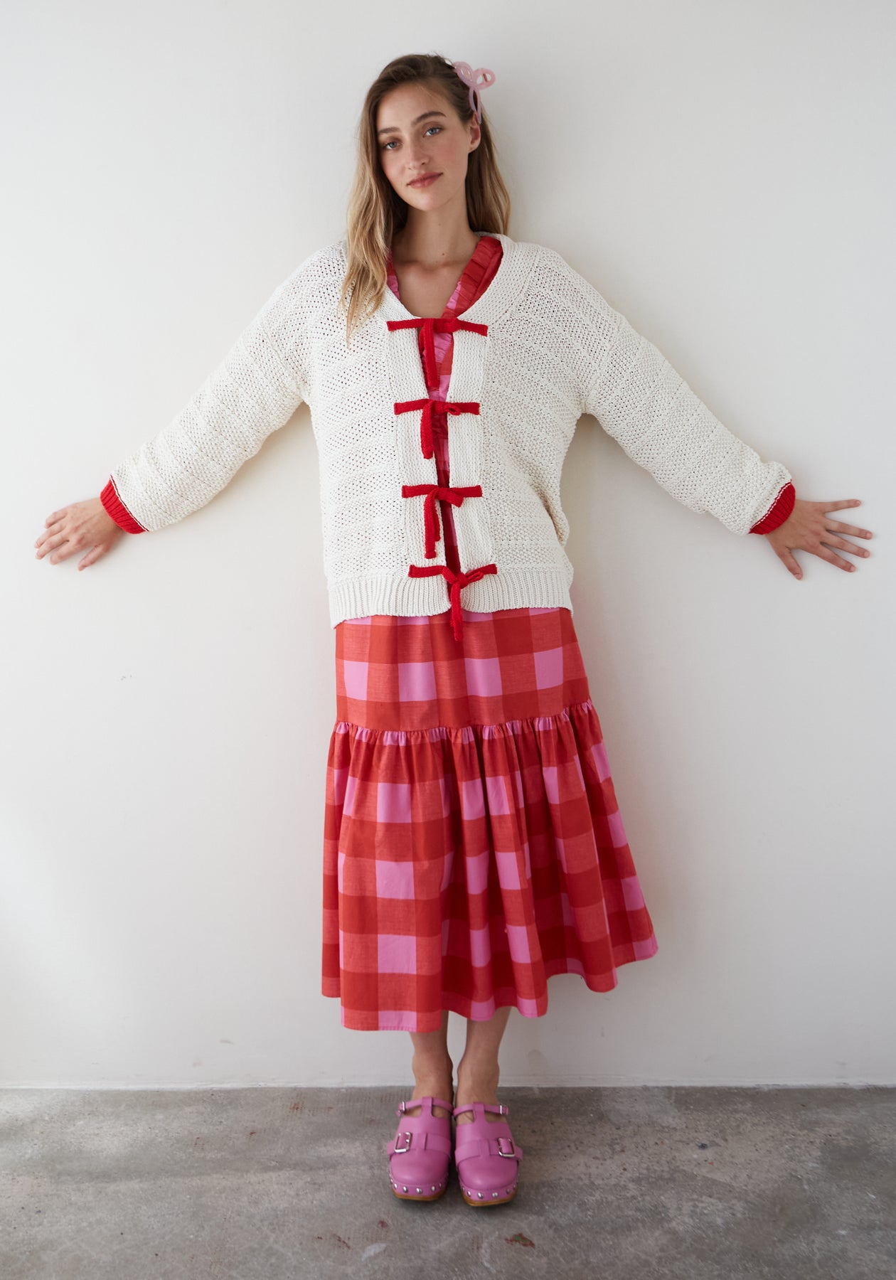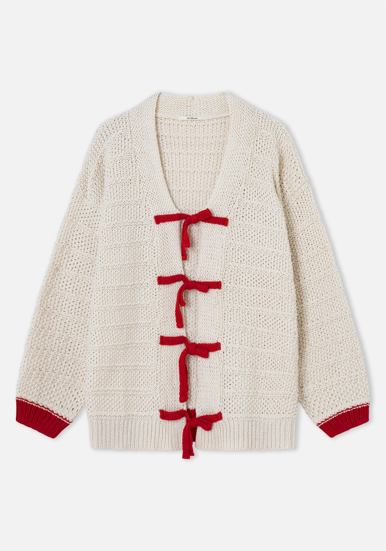 Chaqueta de punto crudo con lazos rojos.