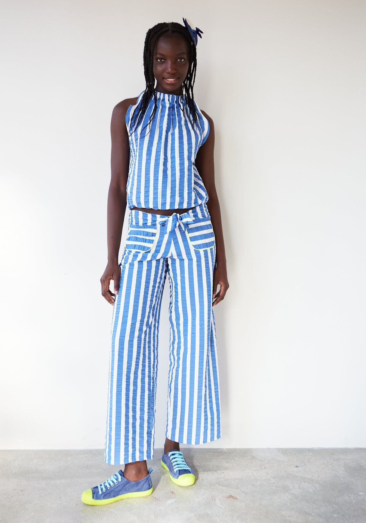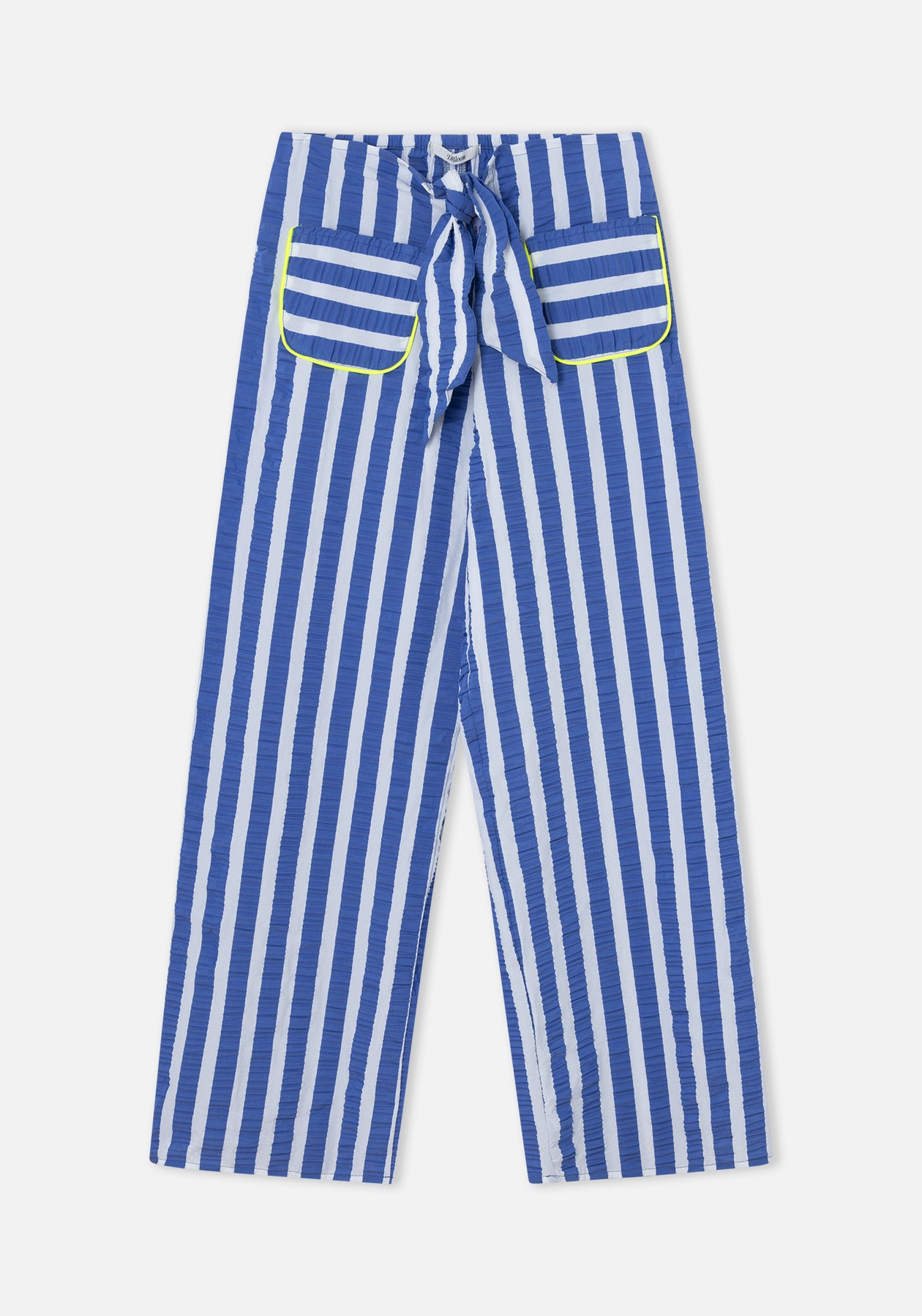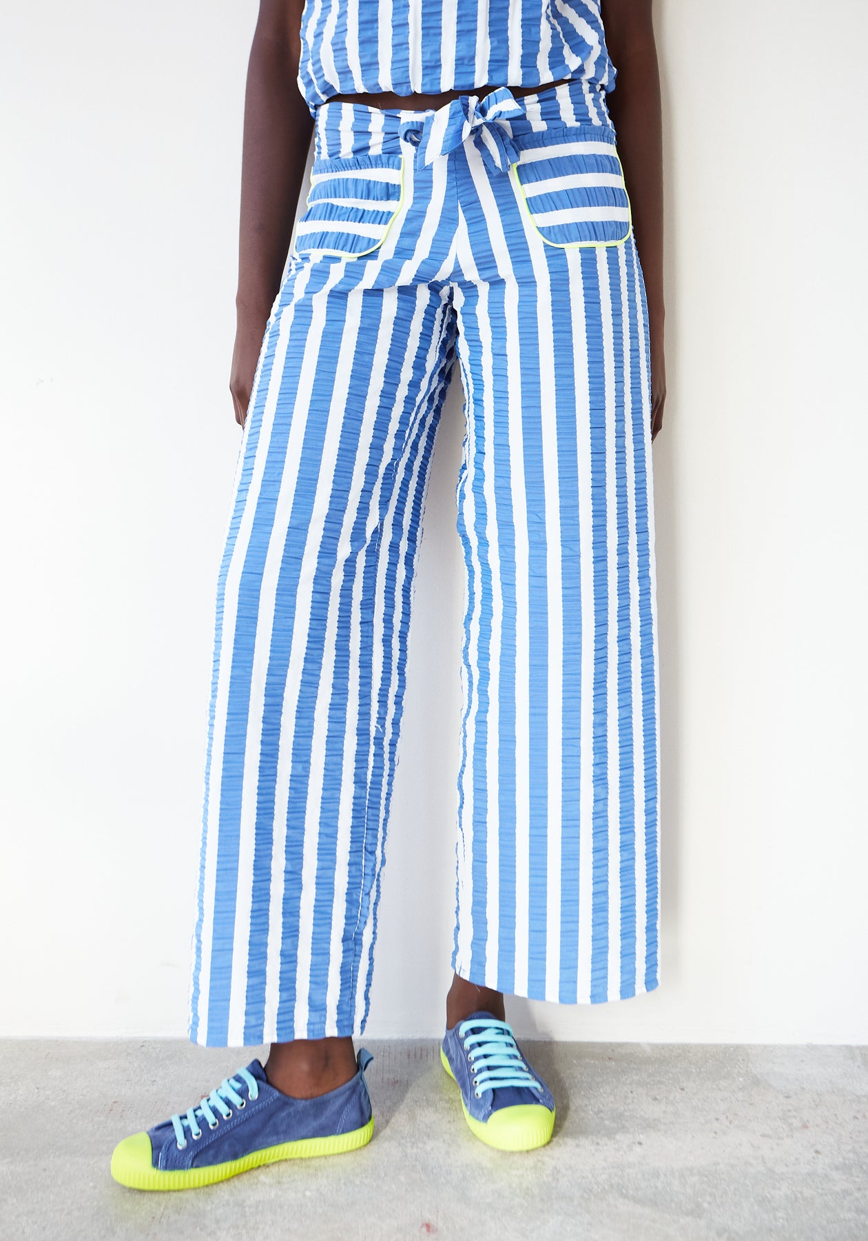 pierna ancha con rayas verticales azules y blancas.