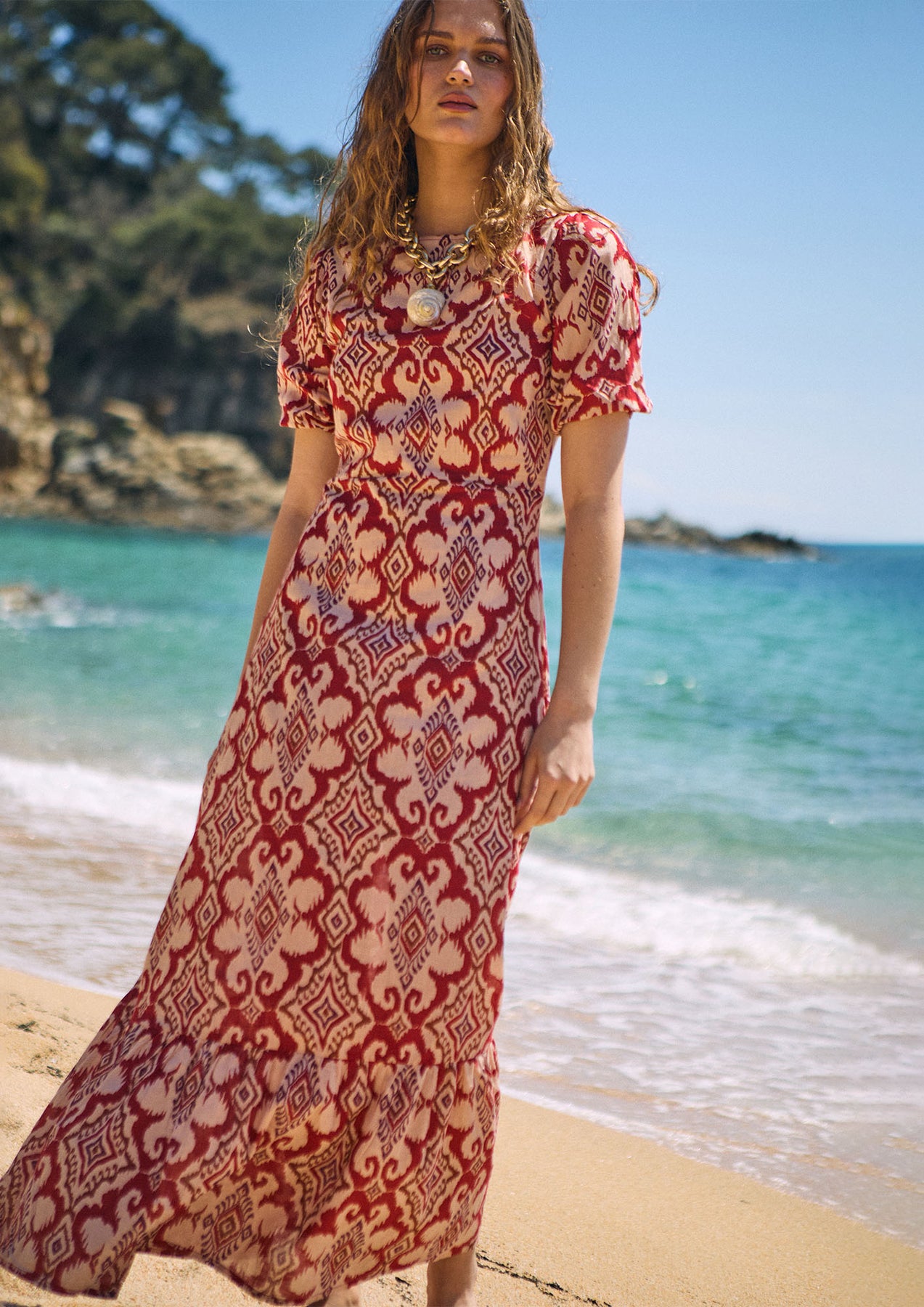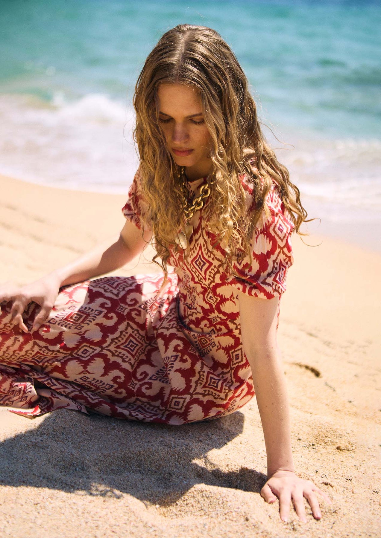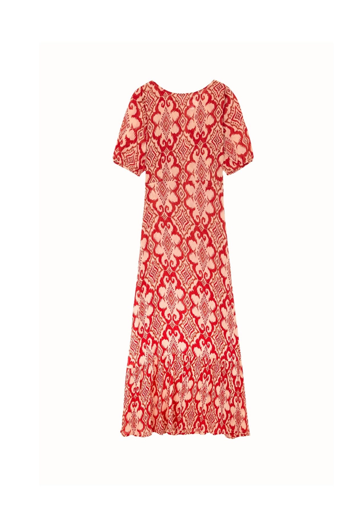 Print ikat sobre fondo rojo.